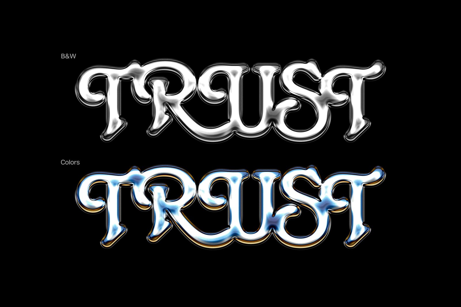 It’s time to unwrap your collection of fonts and start fitting them one by one with our new Iridescent Chrome Text Effect. Handwritten types will turn into vintage car logos. Bubble types will shine bright as the key trend of 2024. Sans serifs and serifs will take a whole new look. Should we continue? The text effect brings chrome aesthetics to its most authentic realization. It’s completed by 2 color options (colored and black-and-white), allowing you to get 10 out of 10 with the final image: logotypes, headers, banners, promos, packaging, prints, stickers, and branding identity elements.